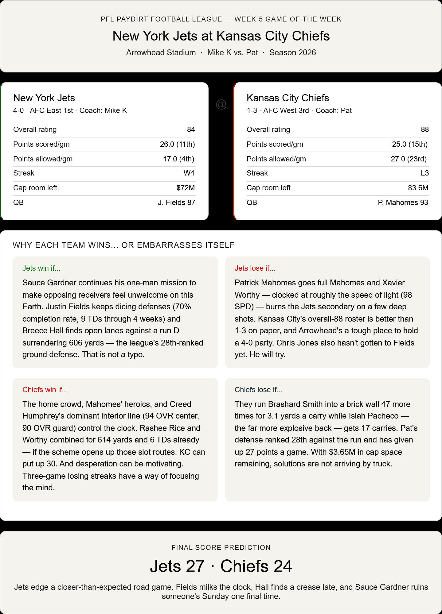 The Setup The Jets arrive in Kansas City with a perfect record, a defense that is statistically suffocating (4th in points allowed, flat-out dominant against the run at No. 1 in the league), and a quarterback in Justin Fields who is playing like he finally read his own depth chart rating. Fields is completing 70% of his passes with 9 touchdowns and only 2 picks through four weeks. Breece Hall looks like the Breece Hall everyone was promised before his knee decided to retire early. Meanwhile, Pat's Chiefs are coming off three straight losses, the most recent being a 29-45 shellacking at the hands of the Arizona Cardinals. Their defense has surrendered 606 rushing yards — 28th in the entire PFL — which means the Jets' run game is approximately looking at that matchup the way a shark looks at a seal. A seal that's also wearing a sign that says "please eat me." The Storylines Worth Watching Mahomes vs. The Jets secondary. Pat's guy is 10 TDs, 1,250 yards, and generally doing Mahomes things. But he also has 6 interceptions — one fewer than the Jets' entire offense through four games. Sauce Gardner (95 OVR, elite coverage stats) is the best corner in this league, and he's going to be assigned to Xavier Worthy, whose 98 speed rating suggests he was created in a lab specifically to torture defensive coordinators. The cap situation in Kansas City. The Chiefs have $3.65 million in cap room. Mike K's Jets have $72 million. You can't buy wins in Madden with cap space, but you can buy depth — and depth is exactly what the Jets have that KC doesn't. Quinnen Williams vs. Creed Humphrey. Quinnen (91 OVR) is a wrecking ball in the interior. Creed Humphrey (94 OVR) is arguably the best center in the PFL. This is the matchup nobody is talking about and the one that will decide field position all game long. Final Verdict The Jets are the better-coached, better-balanced team right now. Their defense is for real, not a mirage — No. 1 in rush defense is not an accident after four games against varying competition. And a road trip to Arrowhead, while never easy, isn't the death sentence it used to be when the Chiefs were a dynasty instead of a team burning through cap space while losing to the Seahawks and Broncos. Pat will make it interesting. He always makes it interesting. Xavier Worthy will probably have one play that makes everyone briefly forget the scoreboard. But in the end, Mike K's Jets are the real deal. Jets 27, Chiefs 24. The perfect record stays intact, the Jets keep rolling, and Kansas City spends the off week contemplating what to do with $3.65 million in cap space. Perhaps a nice dinner.